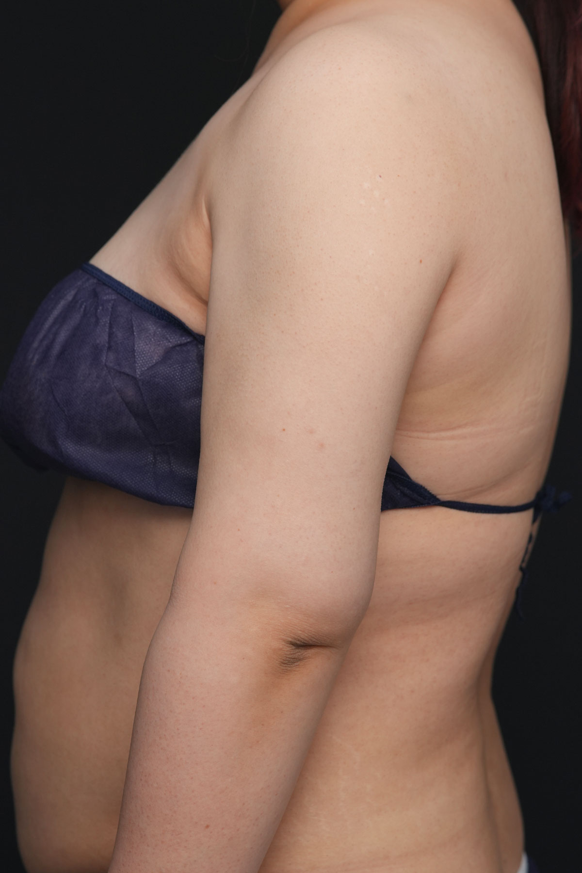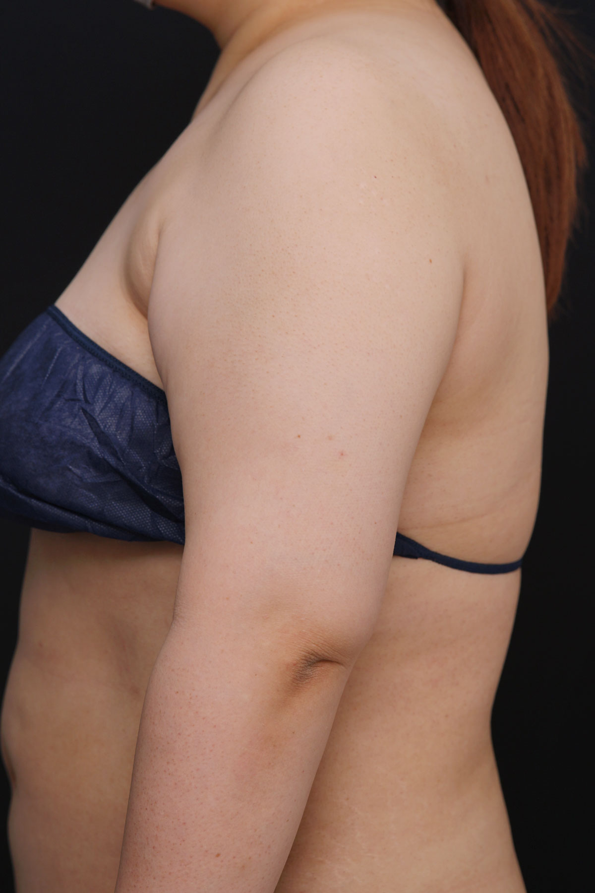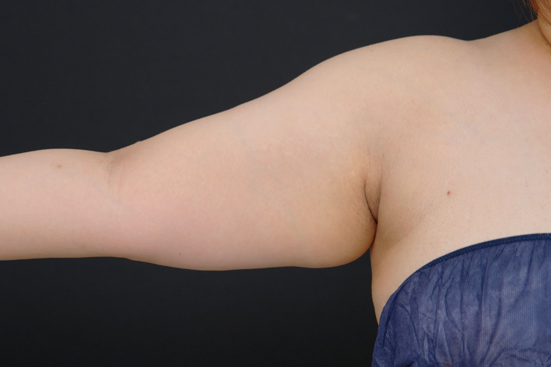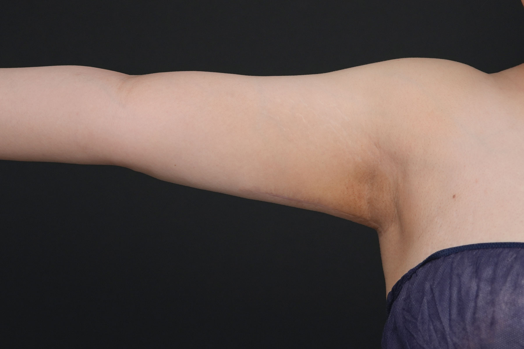 上腕全周+脇肉のハイブリッド脂肪吸引でしっかりと脂肪を取り除き、そのうえで余った皮膚をアームリフトで切除しています。脂肪を減らすだけでは改善しきれない皮膚のたるみを、外科的に整える方法です。